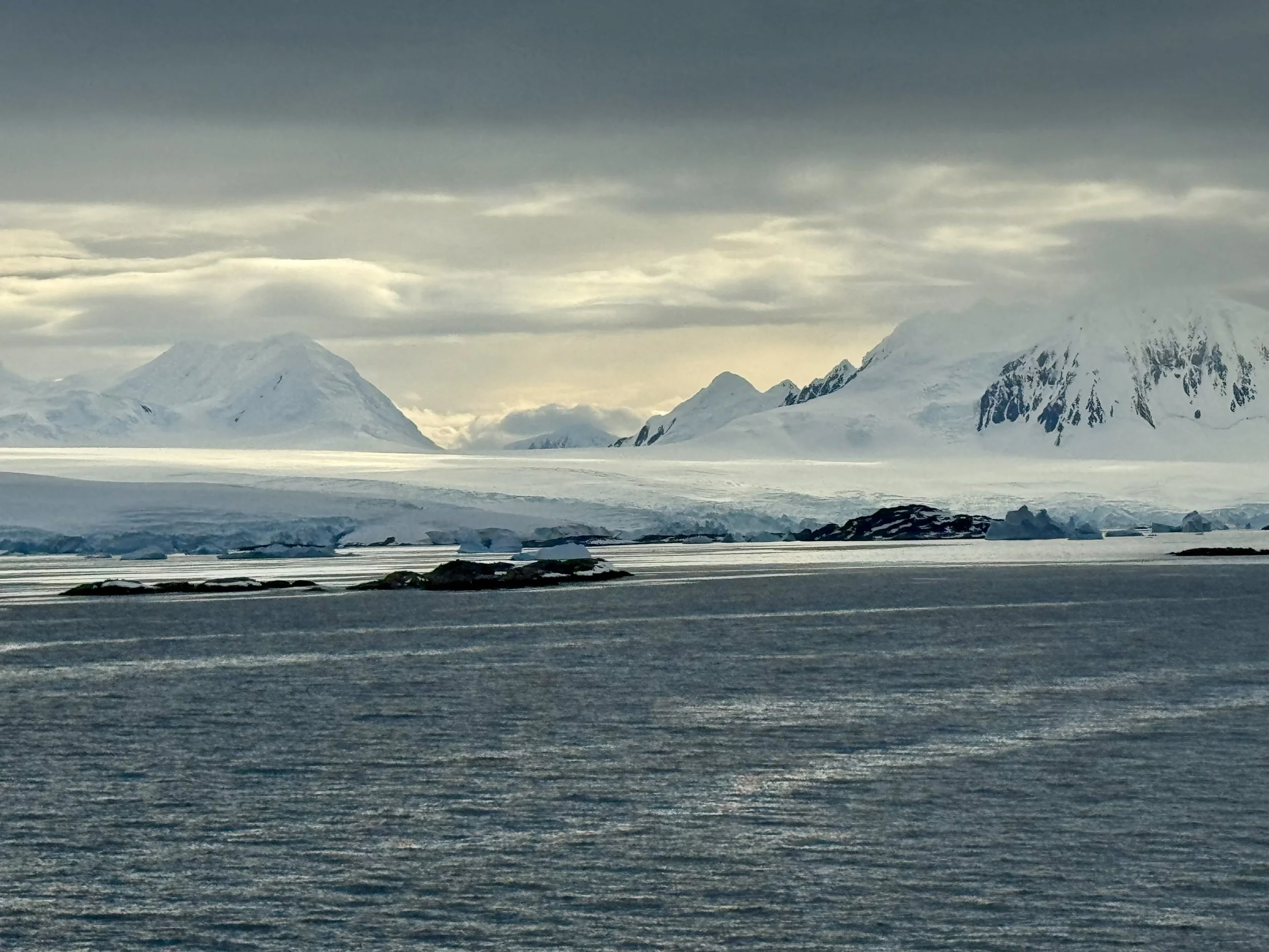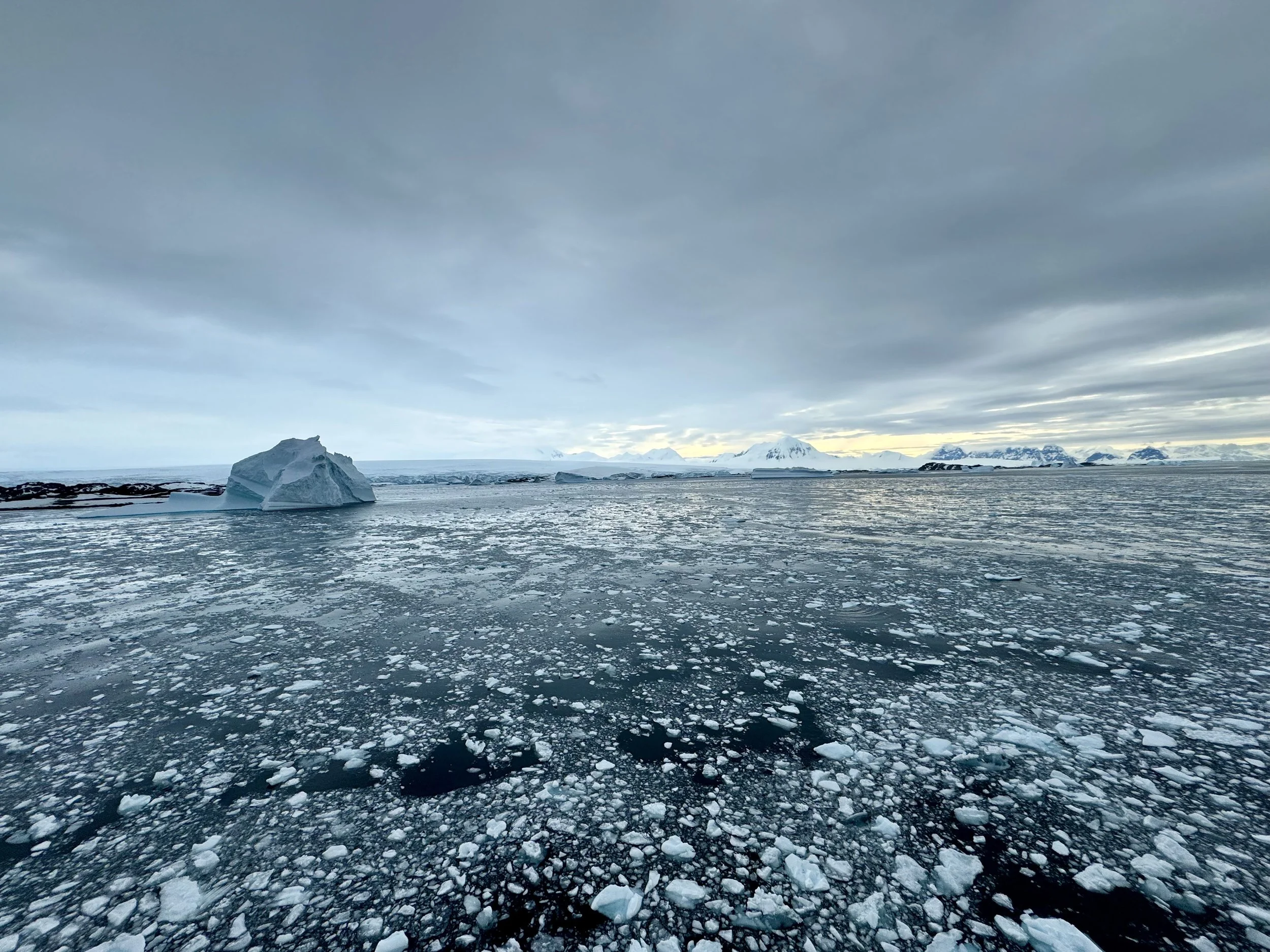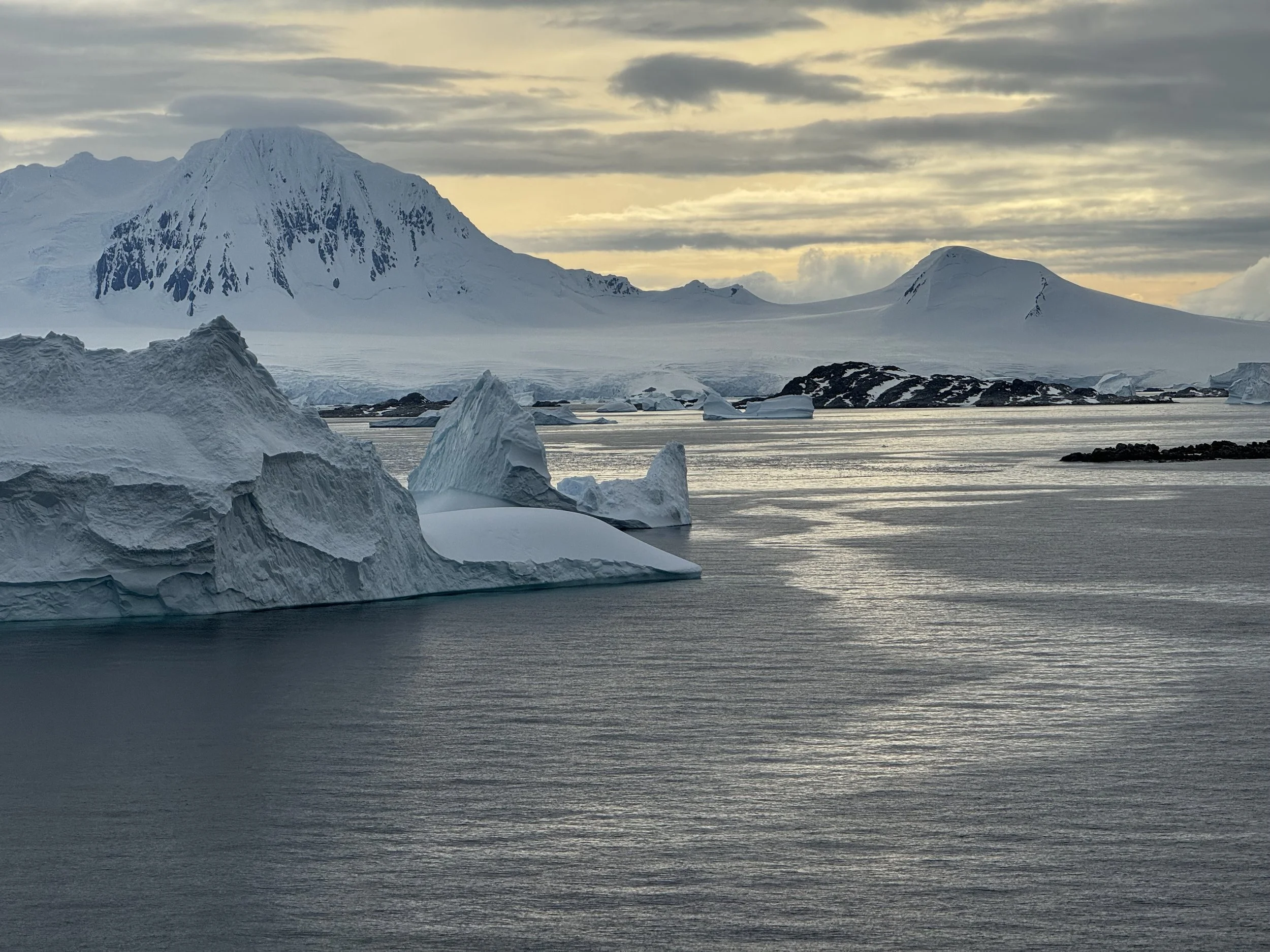 Just before we arrived at Palmer Station, the light in the sky changed and I was able to capture the two images below. Often every tone here is of blue and grey… but the warm color of the sun trying to breach the clouds gave a hue I particularly loved.