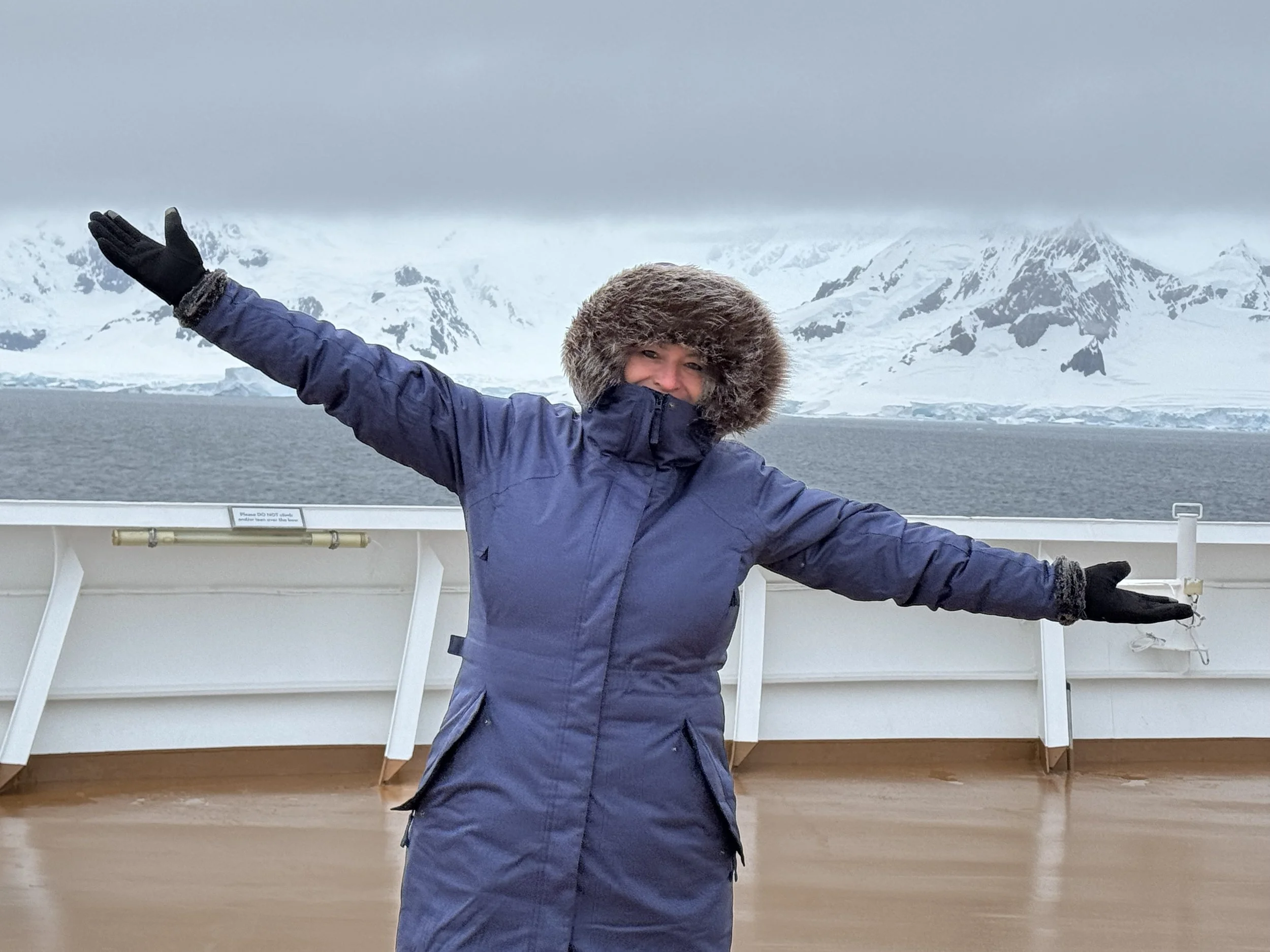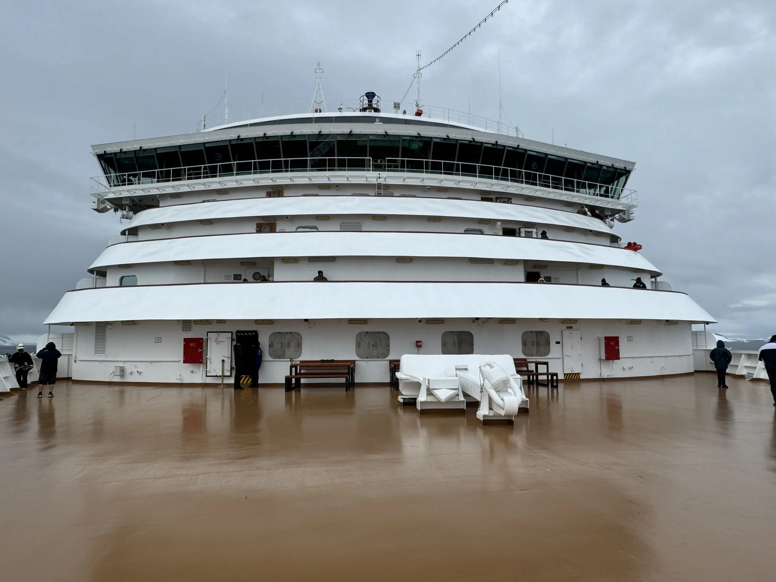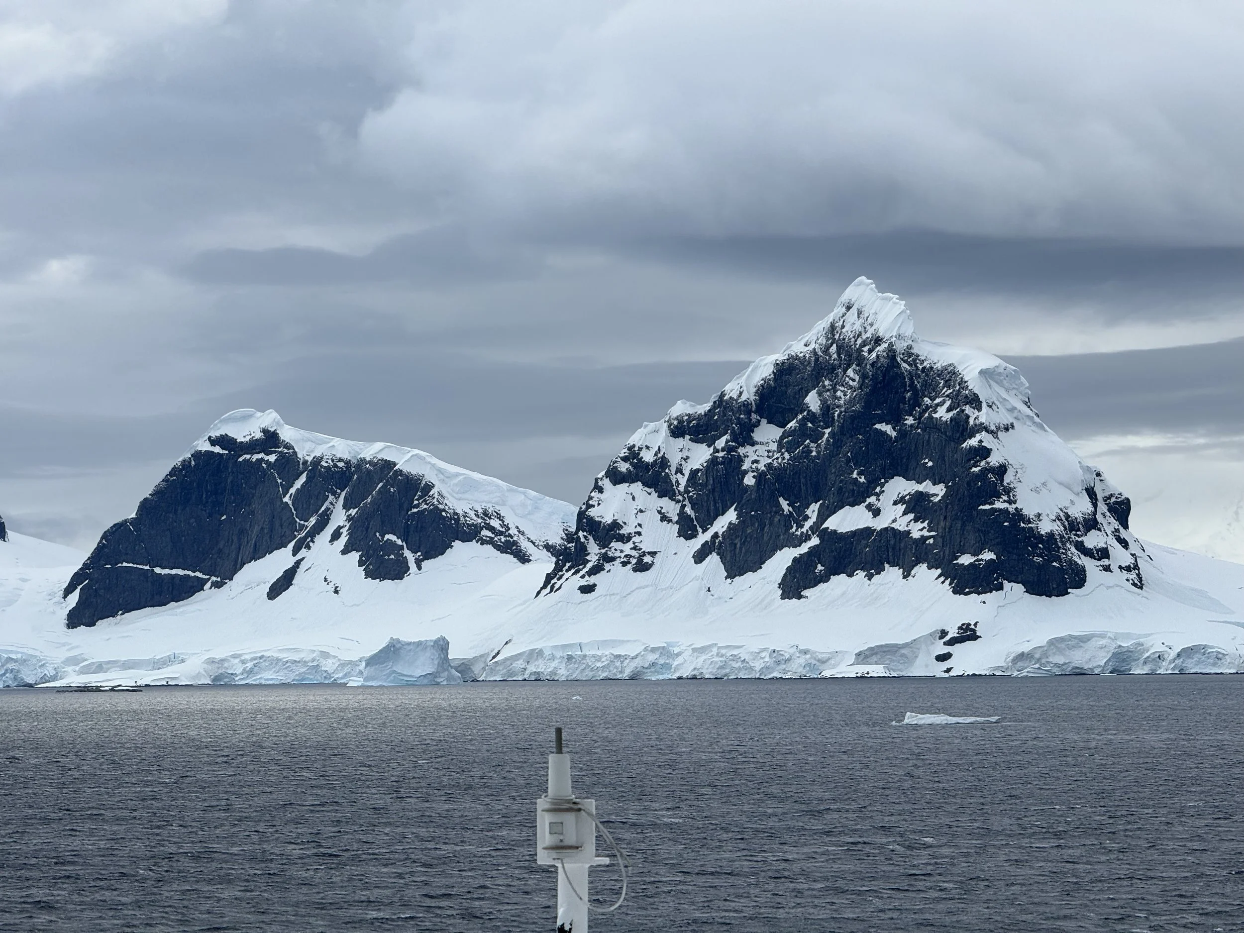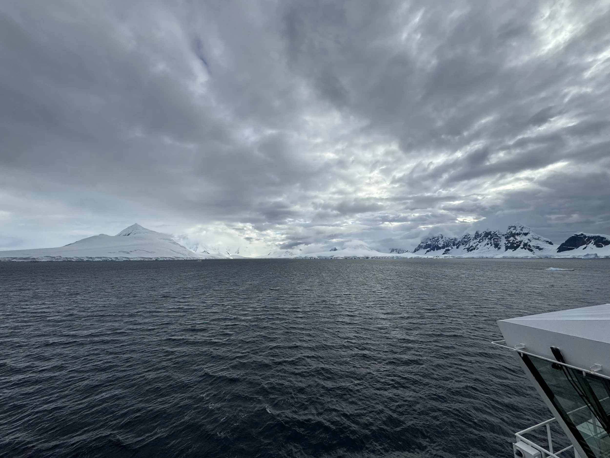 The image above is our first image of the day. 7:02 AM. There’s a fresh ridge of snow across black pinnacles that ascended before us. The air is crisp. We have made our way to our ‘secret’ exterior mini deck because the bow is not yet open.