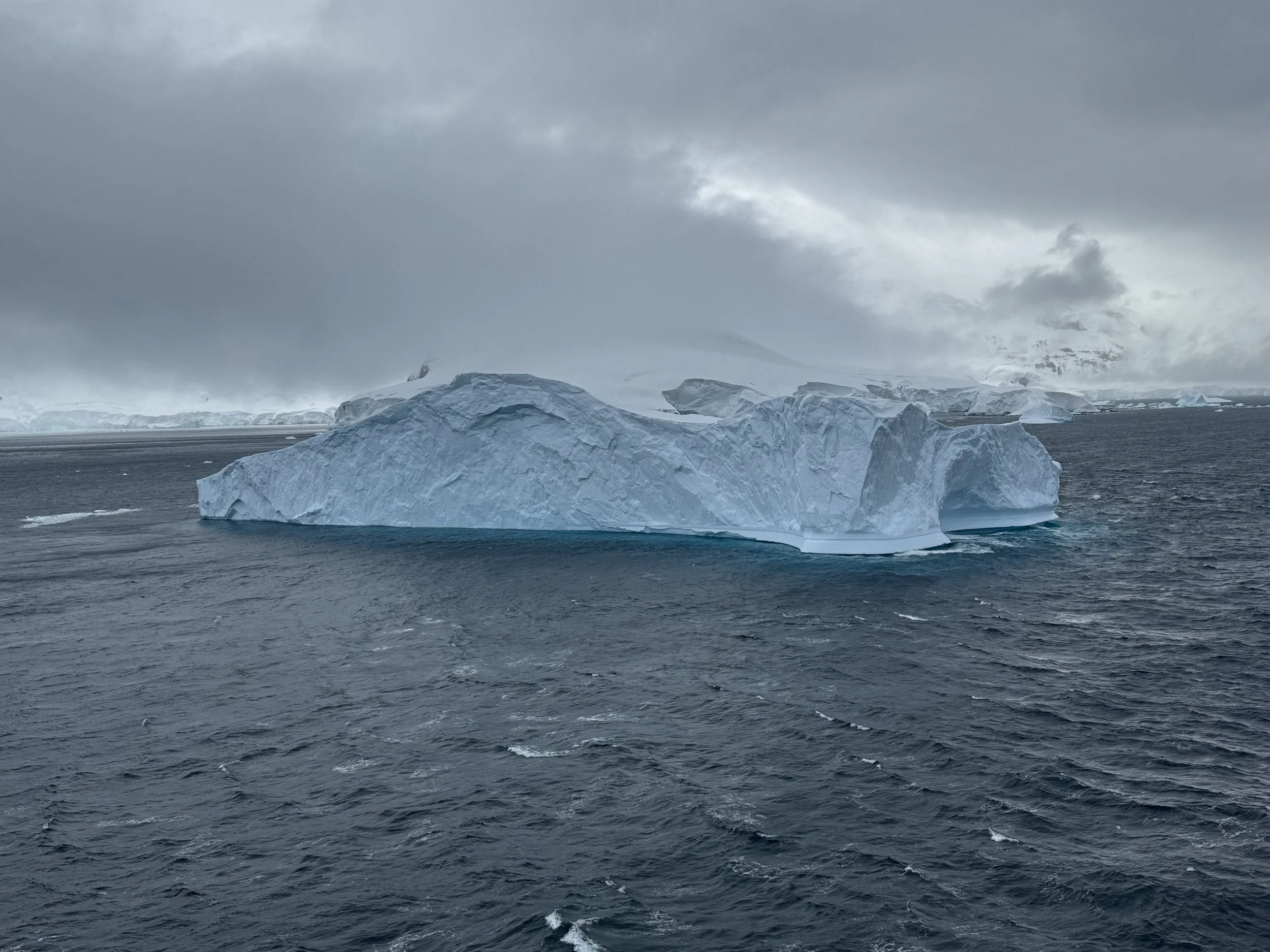 We learn that the Captain, his officers, and the Expedition experts were up all night as well as the scientists from Palmer Station that helped the ship navigate to multiple safe points overnight. As it turned out, at it’s peak near midnight, the storm intensified to 65-70 mph sustained winds with gusts even higher. With the front of the ship safely pointed directly into the storm, the Captain shared that the rear of the ship spent the night at a 20 degree drift off starboard which meant navigating to avoid icebergs would be very challenging. So, they navigated away from icebergs moving at over 20-25 km/hr with the help of the Palmer Station scientists.