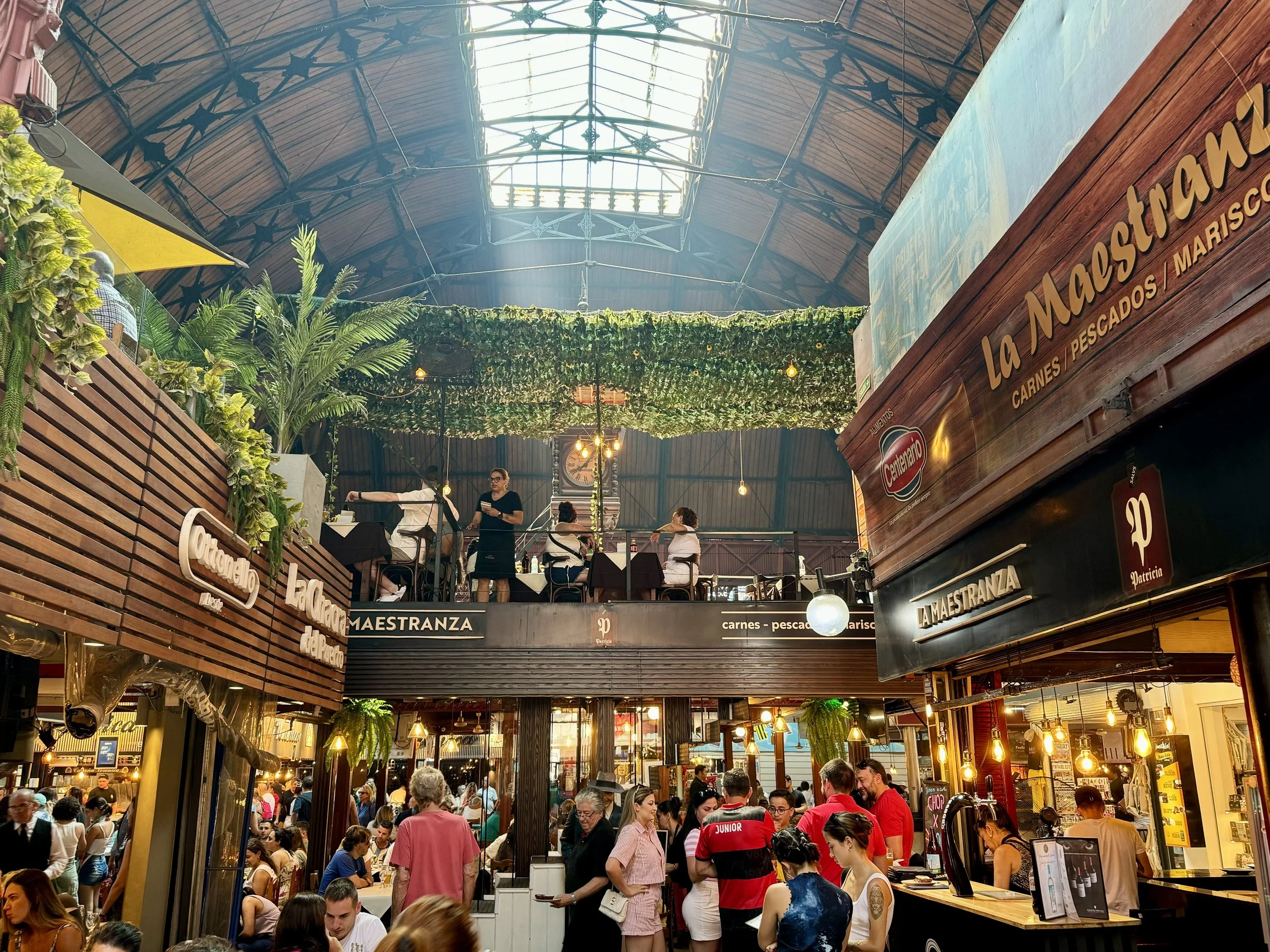Then we make our first stop of two today at a giant marketplace in an old building filled with shops and restaurants, bars and bakeries, and place where people seem to congregate and be festive.