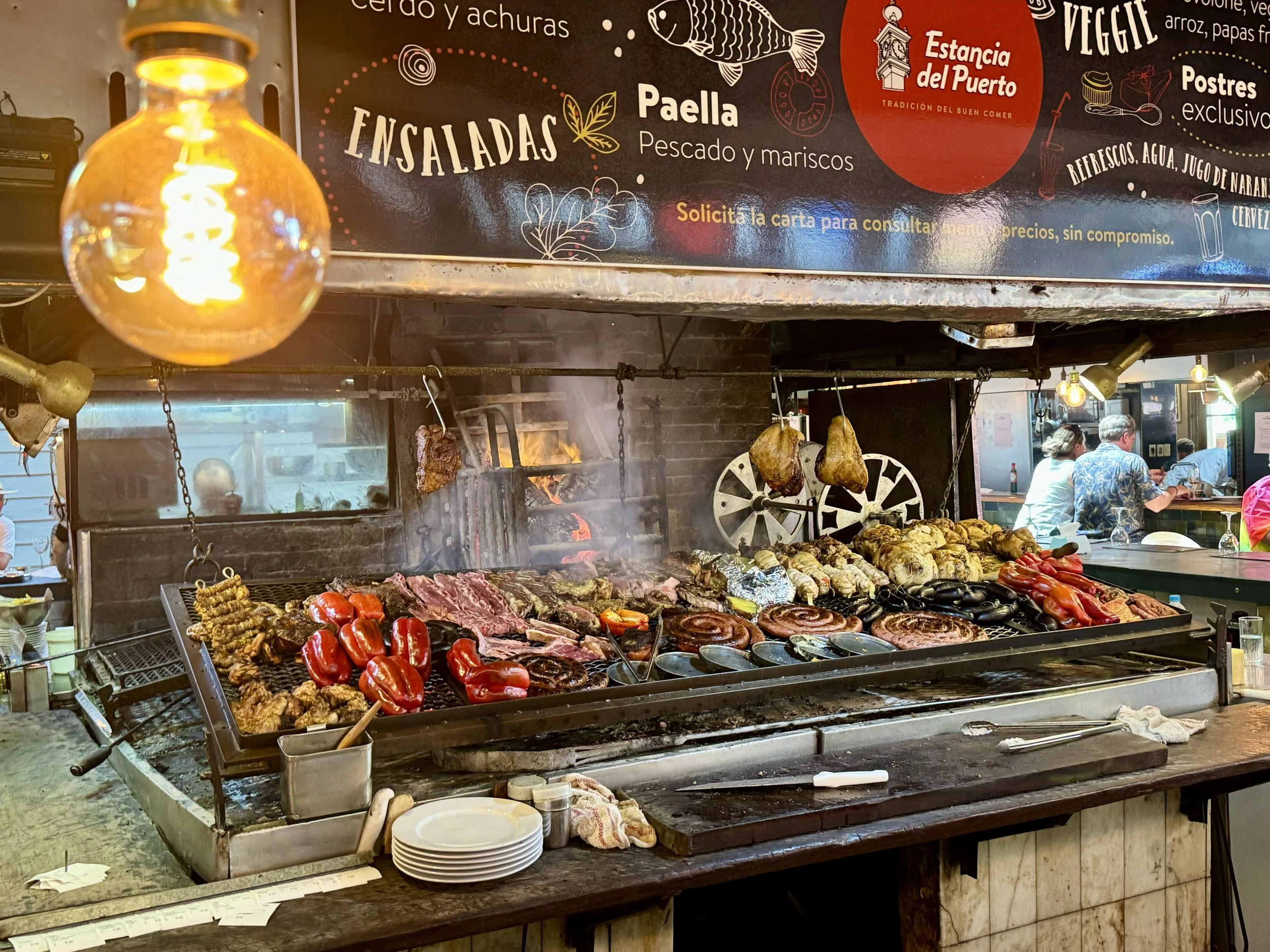 It’s 1:30 in the afternoon and it’s so festive, bustling, and energy-filled that I could just sit and people watch. In fact, dad and I did that for about 15 minutes since we lost the gals in here for a while. But we were starving and needed to pick a place amidst grills of meats and vegetables which were in view from every direction.