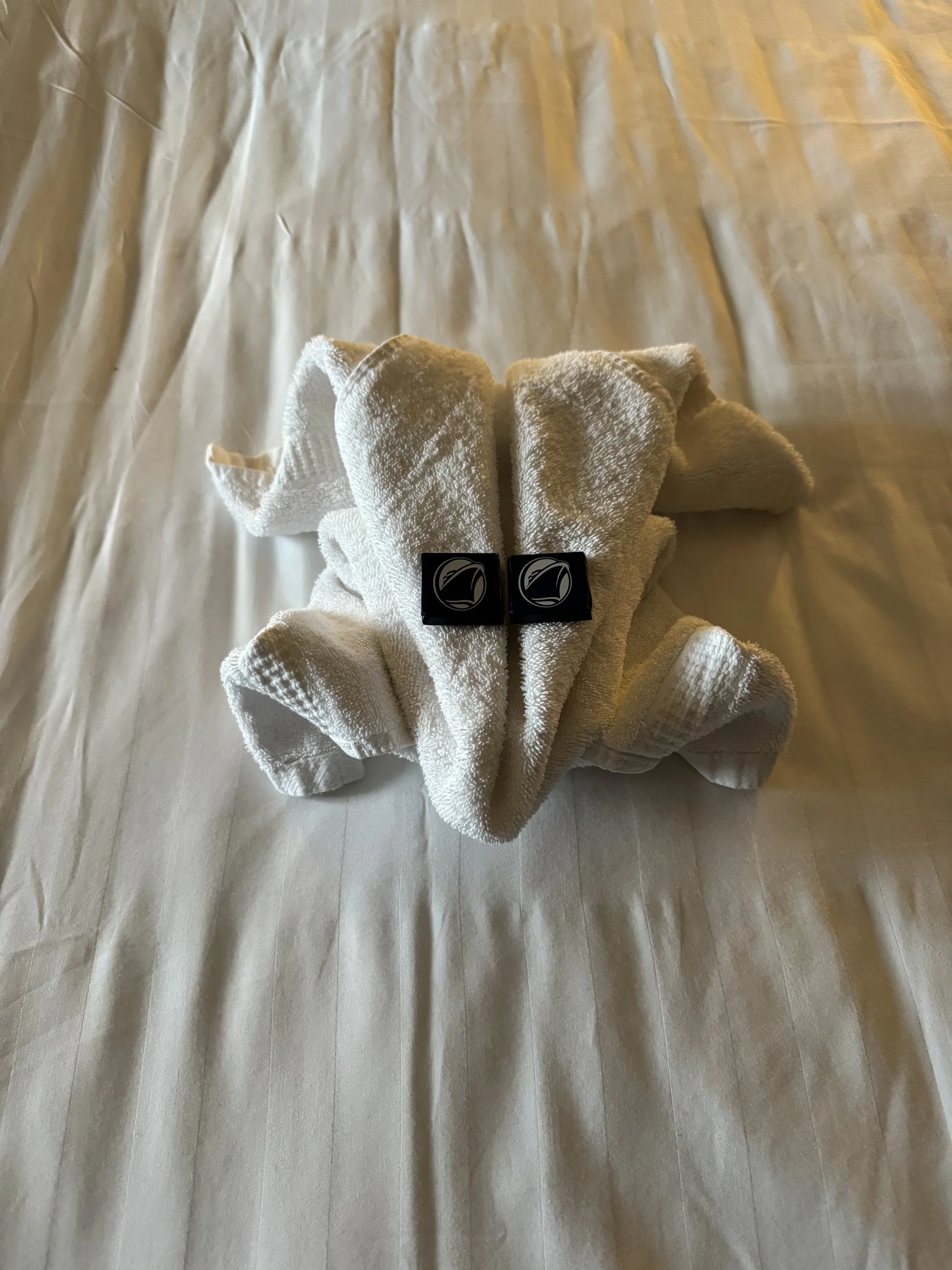 We return to our stateroom after dinner and find this ‘towel sculpture’ below. Our stewards are AMAZING and take incredible care of us.