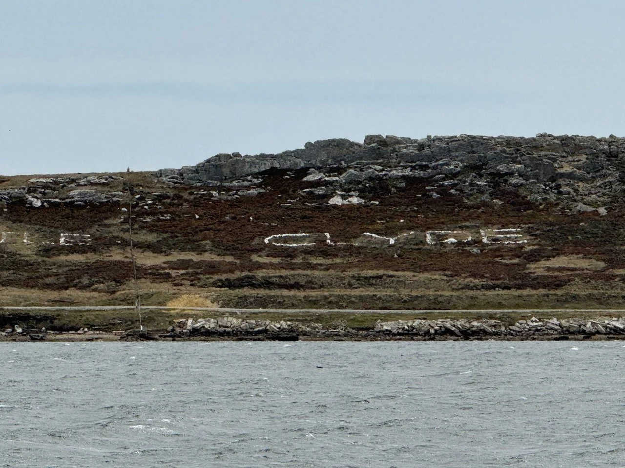I decided to dig into this a bit and learned that the stones are large and bright enough to be visible from a height of 7,000 ft and can be seen on Google Earth (minus Leeds Castle until the satellite imagery is updated) at 51º40'58"S, 57º51'32"W.