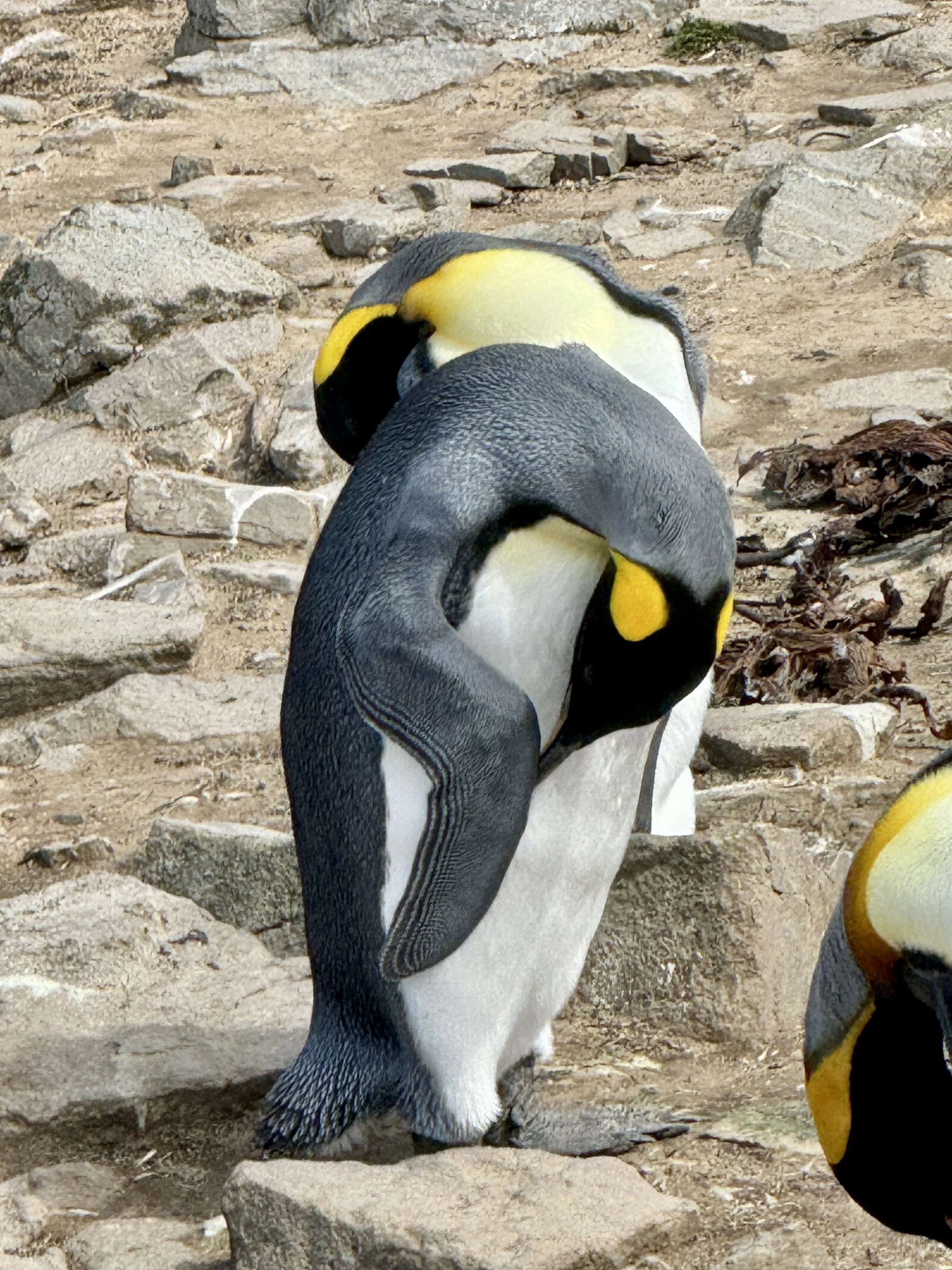 Meet the King Penguin. You might wonder why all of them are sitting in the same manner amidst this group below… and not moving. We learn from the local ranger who is one of many who protect them, that they all had baby chicks 10 days earlier. And, there’s a single chick under almost every one of these brilliant penguins. With any luck we will see one later. The penguin not matching the others and walking around is a Gentoo penguin.