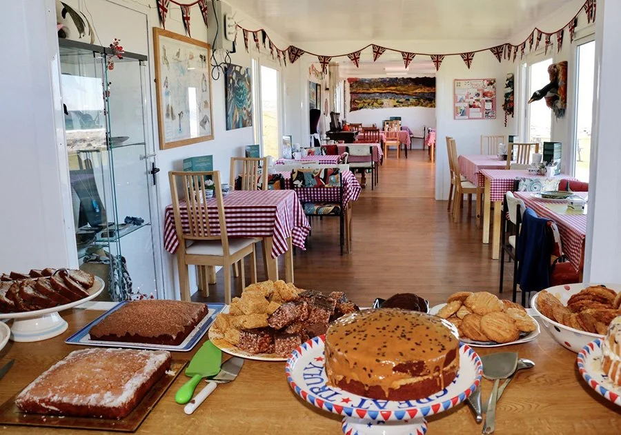 Hattie and Jo stand just behind these baked goods they’ve prepared and the cafe is ready for their first visitors, British flags hanging, wood-burning stove radiating, and checkered red tablecloths screaming ‘Welcome!’