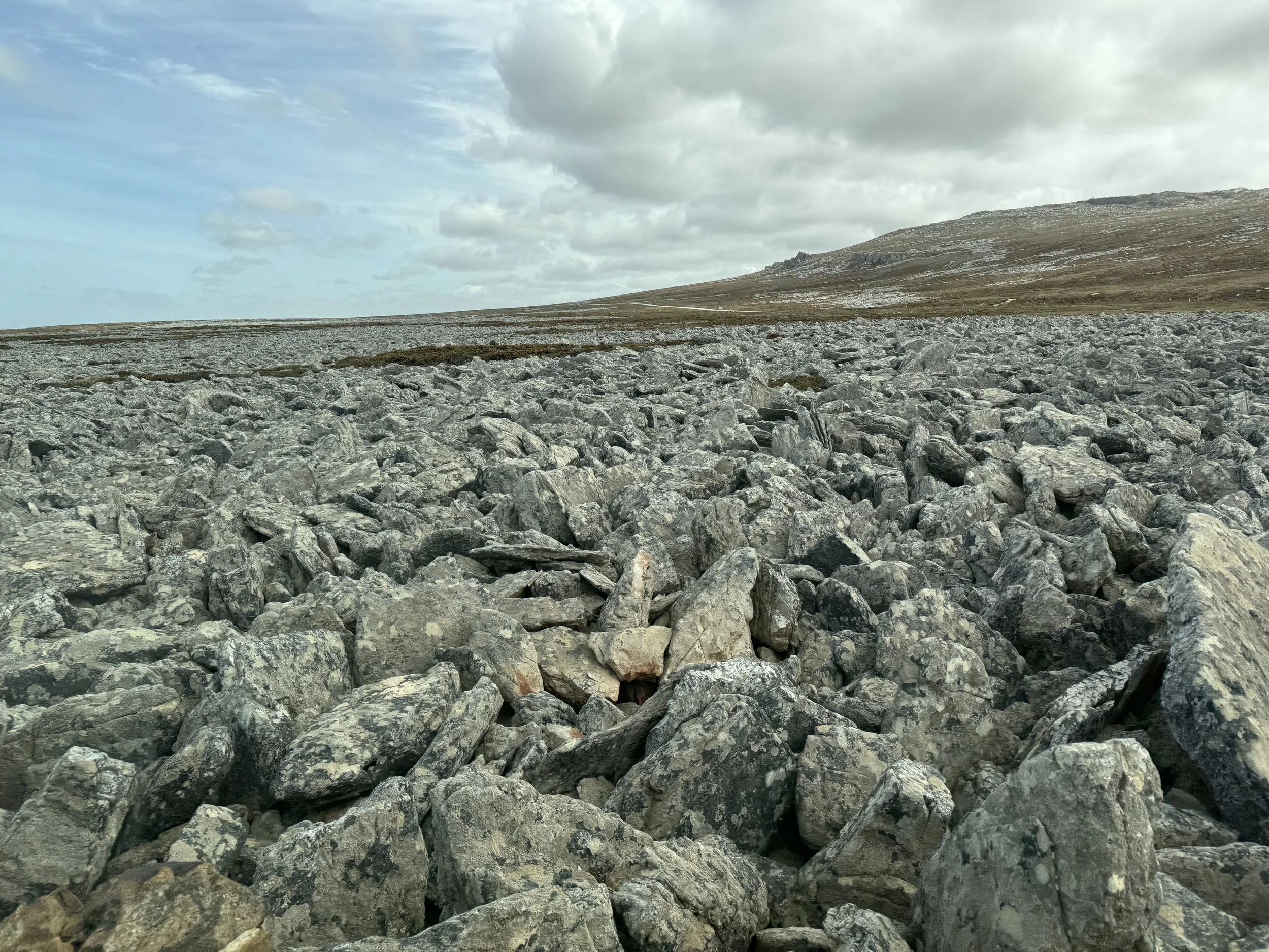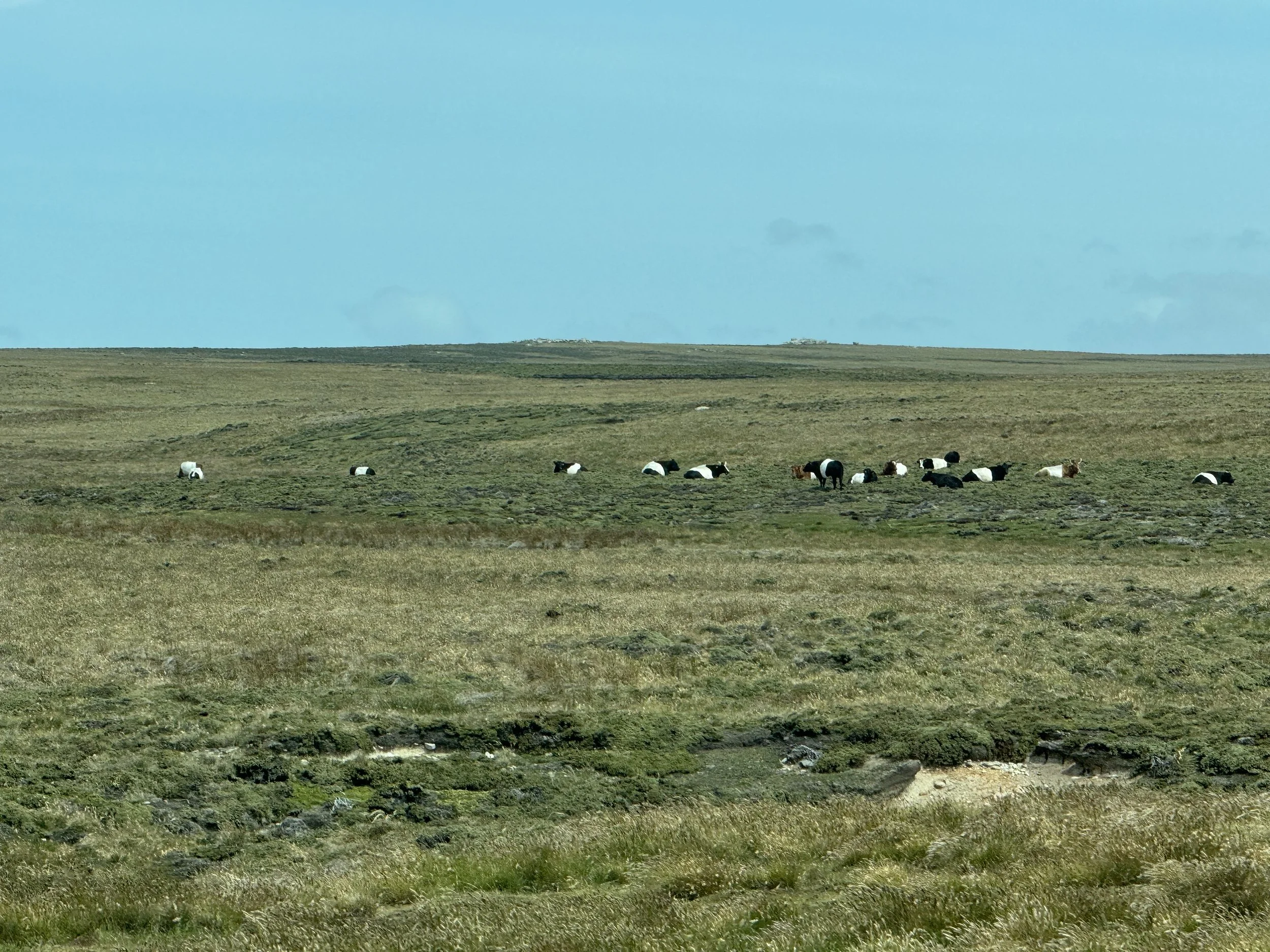 In addition to the battlefield history shared with us on the way, we see miles of stunning stone-runs, flowing down the mountainsides, along with some Belted Galloway Cattle as we arrive into the remote and tranquil lagoon that is Bluff Cove.