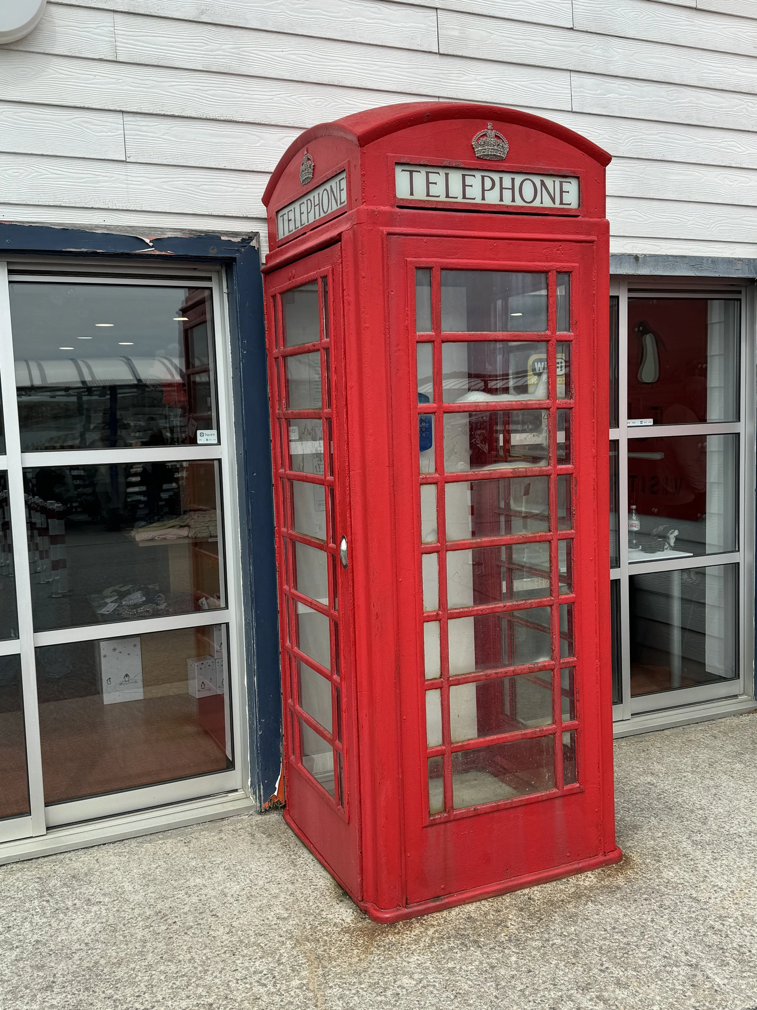 We immediately book the town shuttle to nearby Gypsy Cove for $20 so that if nothing else, we get to hopefully see some penguins close up. As we stand on the dock, there’s no doubt that we’re now on an a British Island with this red reminder & crown next to us.