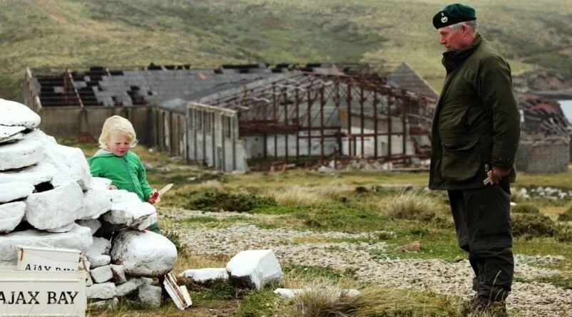 Every year the Kilmartin’s are delighted to welcome back veterans of the 1982 war to have the opportunity to express their gratitude. This year they hosted the Welsh Guards and the Gunners. From previous pilgrimages they have enjoyed visits from the Gurkhas, 42 Commando led by their Colonel Nick Vaux and Peter Cameron, commanding officer of “3 Commando Brigade” helicopters, pictured here (below) with Toby laying a wreath to fallen comrades at the Ajax Bay 1982 field hospital on San Carlos water.